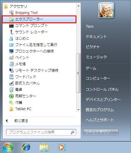 「アクセサリ」内の「エクスプローラー」を起動します。