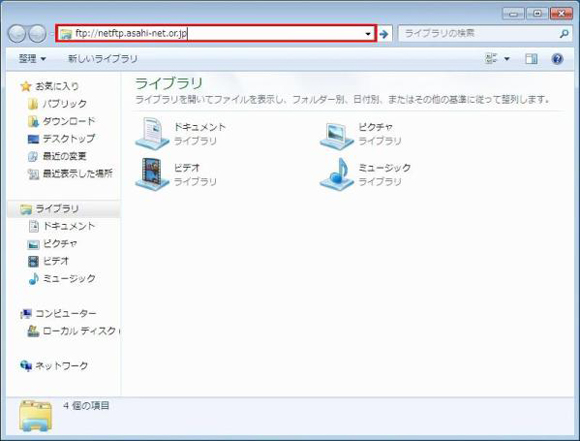 2. 上記を参考にエクスプローラーのアドレス欄に「ftp://」と続けてホームページのサーバを入力し、