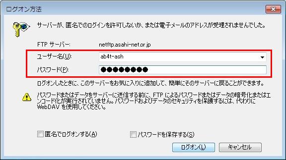 | ユーザー名 | FTP用ID (例:F1234AB567C) |