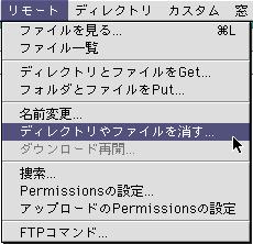 3. 「リモート」メニューから「ディレクトリやファイルを消す...」を選択します。