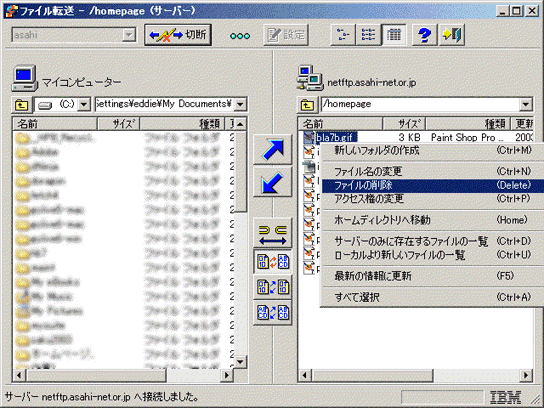 2. FTPサーバ内 (画面右枠)で、削除するファイルを選択します。