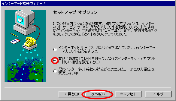 下記のように「電話回線またはLANを使って・・・・」をチェックして「次へ」をクリックします。
