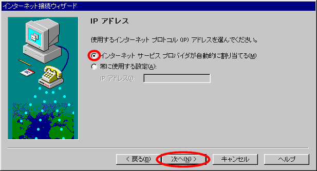 「インターネットサービスプロバイダが自動的に割り当てる」にチェックを入れて「次へ」進みます。