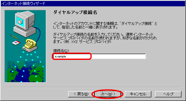 「接続名」に「example」と入力してください。(別の名前でも構いません)