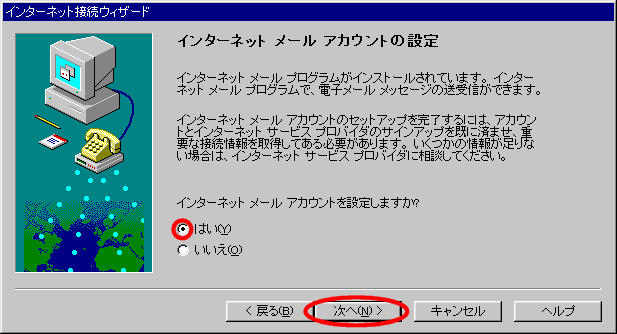 メールの設定をされる方は、「はい」を、されない方は、「いいえ」をチェックして「次へ」進みます。