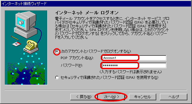 「次のアカウントとパスワードでログオンする」にチェックを入れ、