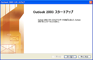 初めてOutlook 2003を起動した場合、[Outlook 2003 スタートアップ] 画面が表示されますので、[次へ] ボタンをクリックします。 |