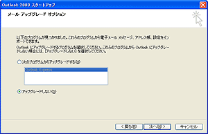 すでにお使いのメールソフトウェアがある場合、[メール アップグレード オプション] 画面が表示されます。 ※メールソフトを選択すると、電子メールメッセージ、アドレス帳、設定をインポートすることができます。 インポートをしない場合、 「アップグレードしない(D)」 を選択 [次へ] ボタンをクリックします。 |