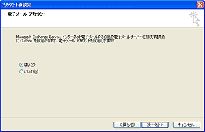 [電子メール アカウント] 画面が表示されます。 「はい」 を選択し、[次へ] ボタンをクリックします。 |