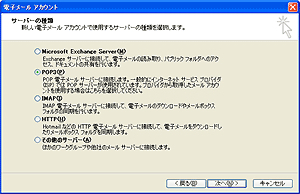 [サーバーの種類] の画面が表示されます。 POP3 を選択し、[次へ] ボタンをクリックします。 |