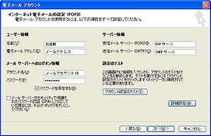 [インターネット電子メールの設定 (POP3)] 画面が表示されたら、以下のように設定します。 名前:お名前 電子メールアドレス:メールアドレス 受信メールサーバー (POP3):POPサーバ 送信メールサーバー (SMTP):SMTPサーバ アカウント名:メールアカウントID パスワード:パスワード メール サーバーがセキュリティで保護されたパスワード認証 (SPA) に対応している場合には、チェック ボックスをオンにしてください:チェックしない [次へ] ボタンをクリックします。 |