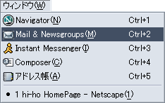 Netscape を起動し、[タスク] メニューから [Mail & Newsgroups(M)] を選択します。 (またはNetscape Navigator のタスクバーから、「Mail & Newsgroups」ボタンをクリックします) |