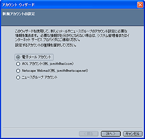 [アカウント ウィザード] 画面が表示されます。 電子メールアカウント を選択します。 「次へ」ボタンをクリックします。 |