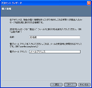 [個人情報] 画面が表示されますので、 [ユーザー名] 画面が表示されますので、 名前: お名前 電子メールアドレス: メールアドレス を入力し、[次へ] ボタンをクリックします。 |