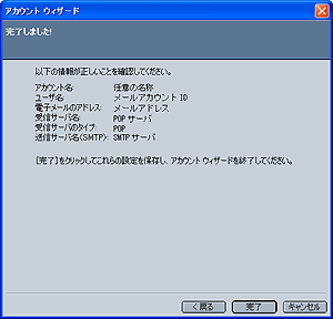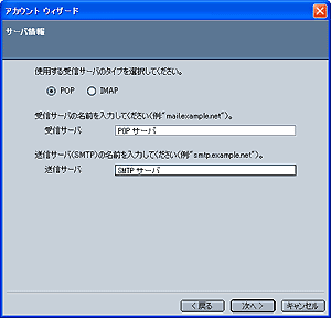 [サーバ情報] 画面が表示されますので、 使用する受信サーバ: POPを選択 受信サーバ: POPサーバ 送信サーバ: SMTPサーバ を入力し、[次へ] ボタンをクリックします。 |