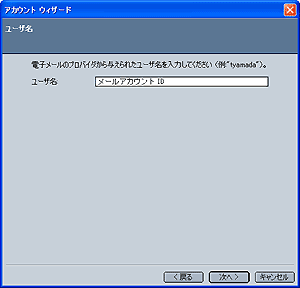 [ユーザ名] 画面が表示されますので、 ユーザ名: メールアカウントID を入力し、[次へ] ボタンをクリックします。 |