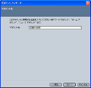 [アカウント名] 画面が表示されますので、 アカウント名: 任意の名称 を入力し、[次へ] ボタンをクリックします。 |