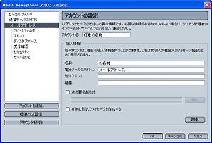 メニューから新たに追加されたアカウント名を選択して、以下の設定をを確認します。 アカウント名: 任意の名称 名前: お名前 電子メールのアドレス: メールアドレス |