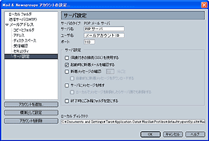 左側のメニューから「サーバ設定」を選択して、以下の設定を確認します。 ユーザ名: メールアカウントID ポート: 110 保護付きの接続(SSL)を使用する: チェックしない 起動時に新着メールを確認する: 任意 新着メッセージの確認: 任意 サーバにメッセージを残す: 任意 |