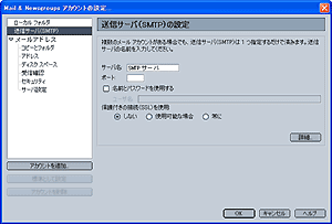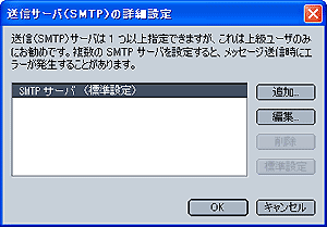 Step3.の「詳細...」ボタンをクリックすると、送信サーバ(SMTP)の詳細設定 画面が表示されますので、 設定したSMTPサーバ名が標準設定となっているか確認します。 | |