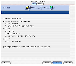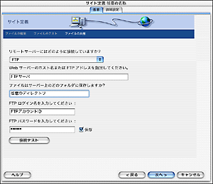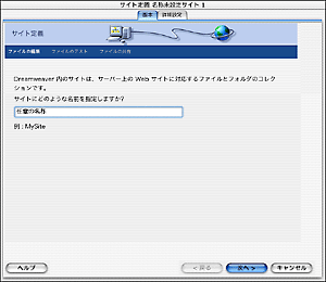 ![]() | [サイト定義 名称未設定サイト 1] 画面が表示されますので、以下の入力を行い、[次へ] ボタンをクリックします。 サイトにどのような名前を確定しますか?: 任意の名称 |