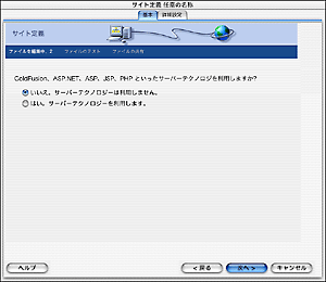 ![]() | [ファイルを編集中 2] の画面が表示されますので、以下の設定を行い、[次へ] ボタンをクリックします。 Coldfusion,ASP,NET,ASP,JSP,PHPといったサーバーテクノロジを利用しますか?: [いいえ]を選択(任意) |