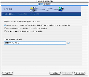 ![]() | [ファイルの編集中 3] の画面が表示されますので、以下の設定を行い、[次へ] ボタンをクリックします。 自分のマシンでローカルコピーを編集し、編集後にサーバーにアップロード(推奨):選択する ファイルを格納する場所:任意のディレクトリ |