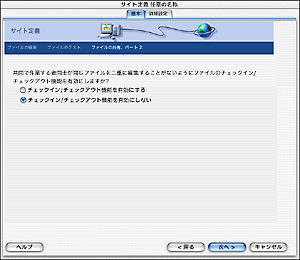 ![]() | [共同で作業をする者同士が同じ.....] の画面が表示されますので、以下の設定をし、[次へ] ボタンをクリックします。 チェックイン/チェックアウト機能を有効にしない: 選択する(任意) |