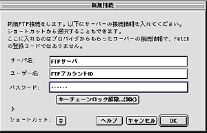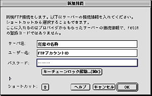 ![]() | Fetchを起動し、[新規接続] 画面が表示されますので、以下の入力を行います。 サーバ名: FTPサーバ ユーザー名: FTPアカウントID パスワード: FTPパスワード |