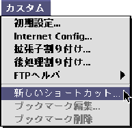 ![]() | [カスタム] メニューから [新しいショートカット] をクリックし、以下の設定と入力を行い、[OK] ボタンをクリックします。 名称: 任意の名称 タイプ: フォルダを選択する サーバ名: FTPサーバ ユーザー名: FTPアカウントID パスワード: FTPパスワード ディレクトリ: 任意のディレクトリ |