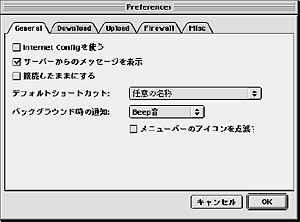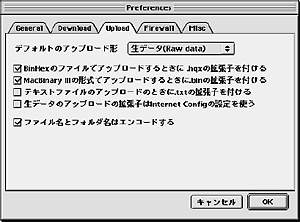 ![]() | [Upload] タブを選択し、以下の設定を行い、[OK] ボタンをクリックします。 デフォルトのアップロード形: 生データ(Raw date): 選択 BinHexのファイルでアップロードするときに.hqx の拡張子を付ける: チェックする MacBinartⅢの形式でアップロードするときに.bin の拡張子を付ける: チェックする テキストファイルのアップロードするときに.txtの拡張子を付ける: チェックしない 生データのアップロードの拡張子はInternet Configの設定を使う: チェックしない ファイル名とフォルダ名はエンコードする: チェック |