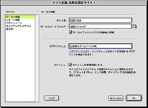 [サイト定義 名称未設定サイト 1] 画面が表示されますので、以下の設定と入力を行います。 サイト名: 任意の名称 ローカルルートフォルダ: 任意のフォルダ ※ホームページのデータが保存してある、お客様のPCのハードディスク上のフォルダを指定します。 [ローカルファイルリストを自動的に更新]: 任意 HTTPアドレス: お客様のホームページURL [キャッシュを使用可能にする]: チェック |