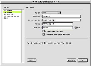 [カテゴリ] から [リモート情報] を選択し、以下の設定と入力を行い [OK] ボタンをクリックします。 アクセス: FTP FTPホスト: FTPサーバ ホストディレクトリ: 任意のディレクトリ ログイン: FTPアカウントID パスワード: FTPパスワード ※次回接続時にパスワードを入力する場合は、[ 保存 ]のチェックをしてください。 |