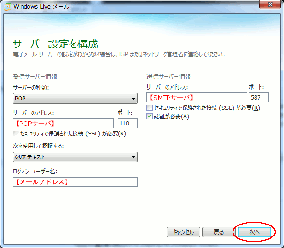 | サーバの種類 | POPを選択します。 |